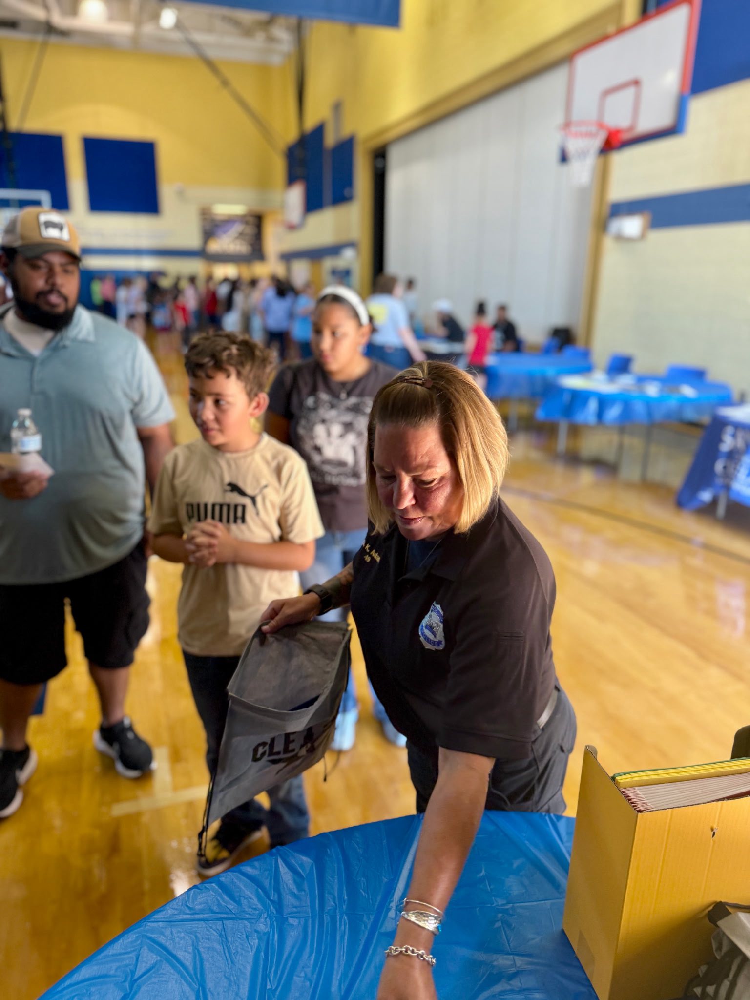 An officer hands out school supplies to children and families at a table inside the RG Jones School gym.