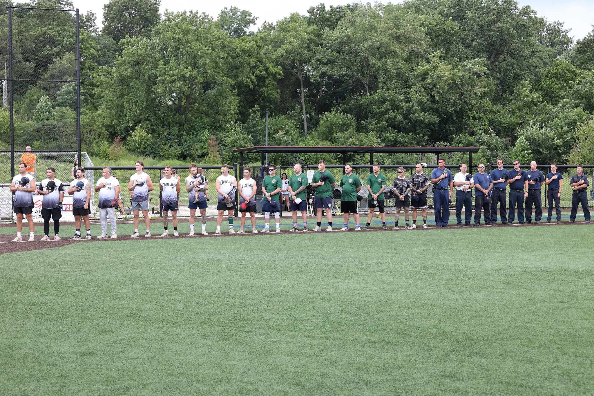 Cleveland Fire softball team members stand with hands over hearts during the national anthem before the Police/Fire game.