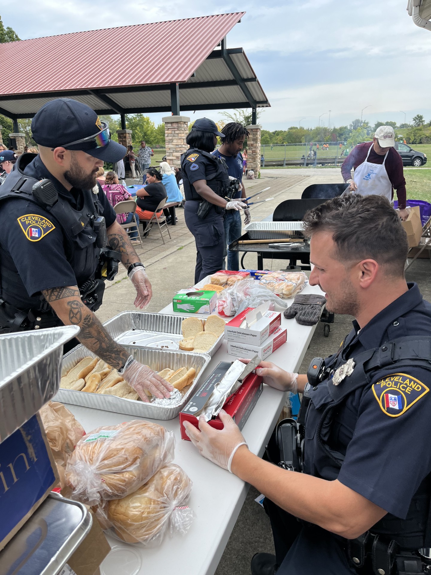 Second District officers serving hot dogs and burgers at the grill with volunteers.