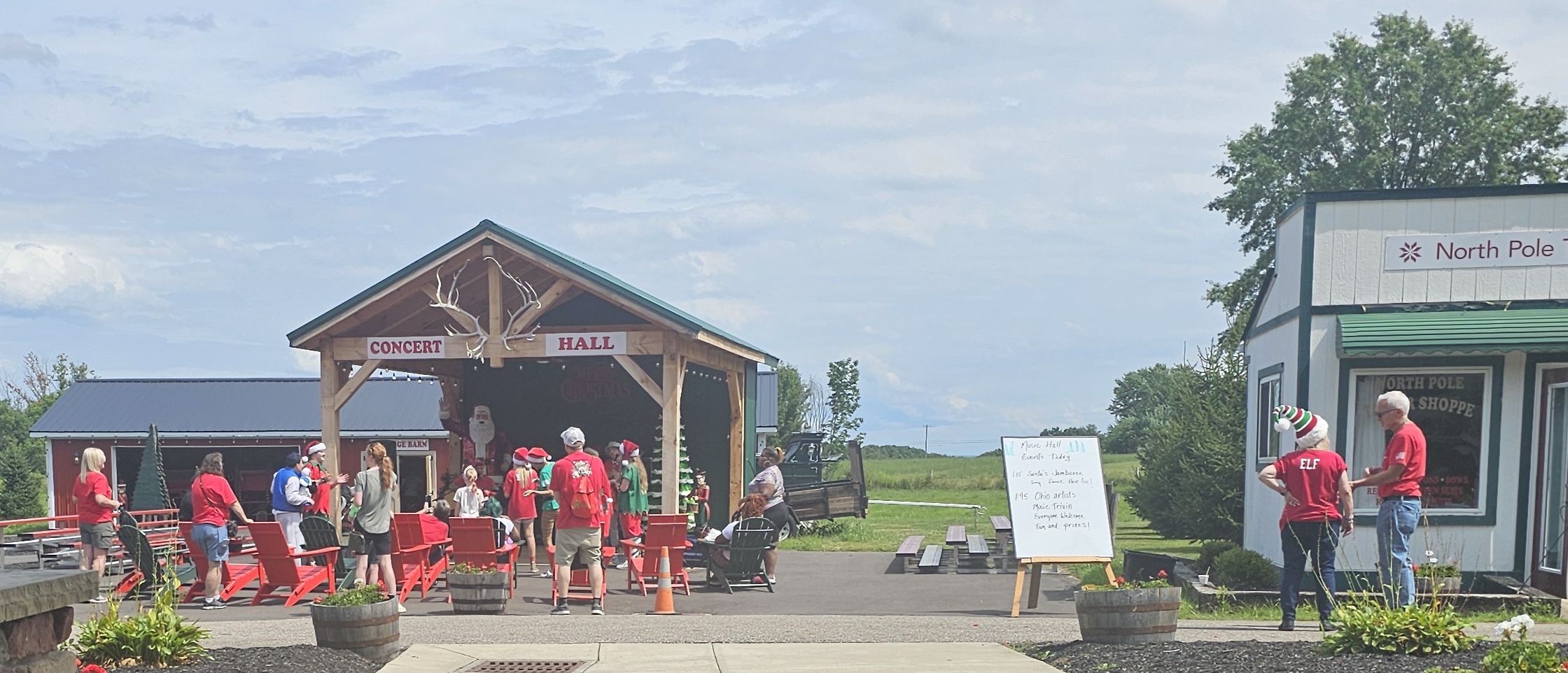 Audience seated outside the concert hall watching Santa and holiday performers on stage.