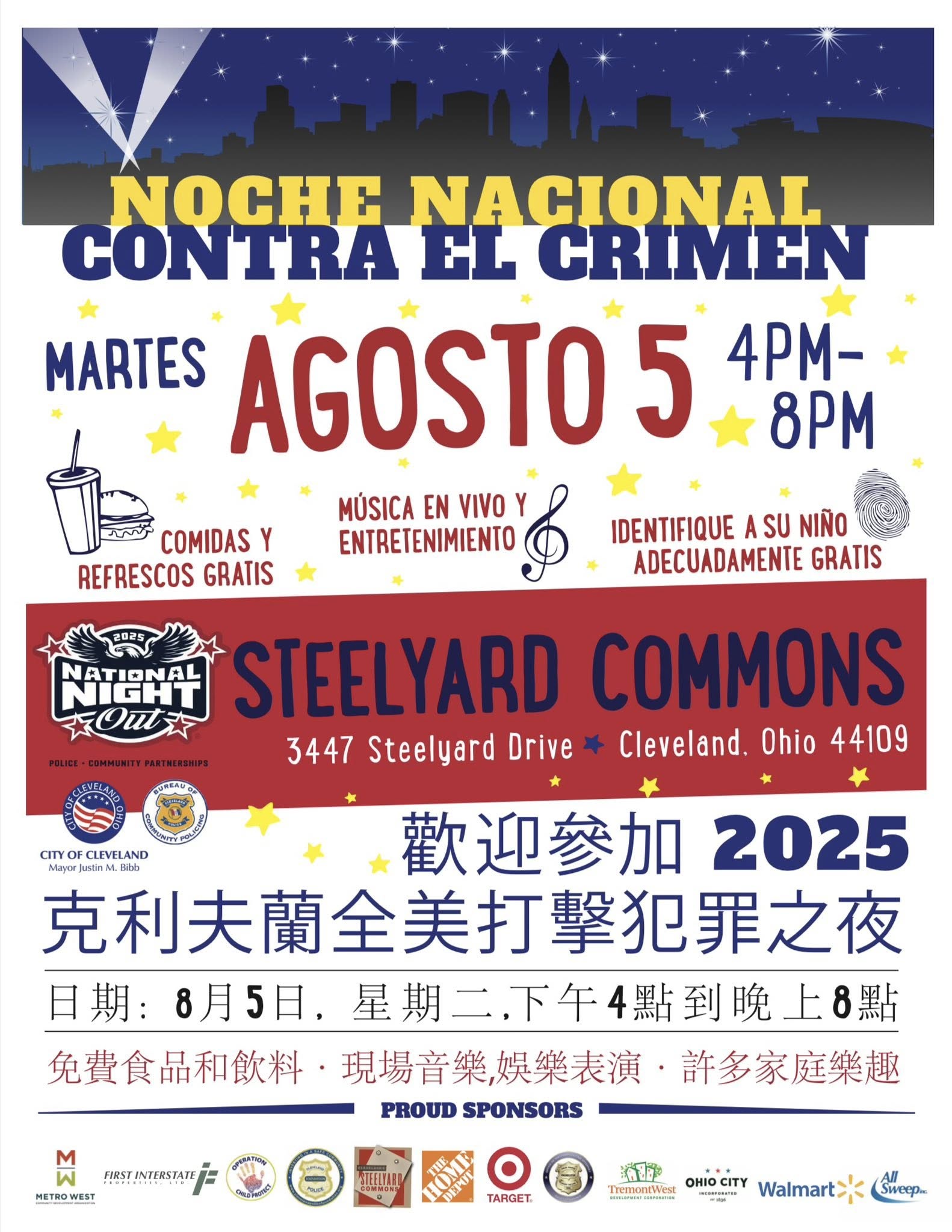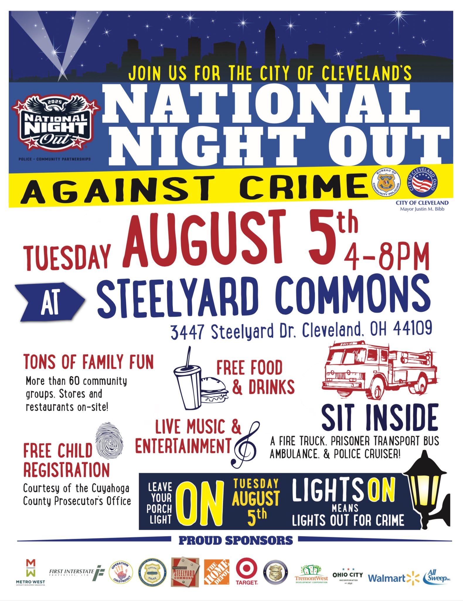 National Night Out Against Crime returns to Steelyard Commons on Tuesday, August 5 from 4 to 8 PM. Hosted by Cleveland Police and the City of Cleveland, the event offers a free, family-friendly way to connect with officers and local services in a relaxed setting.
