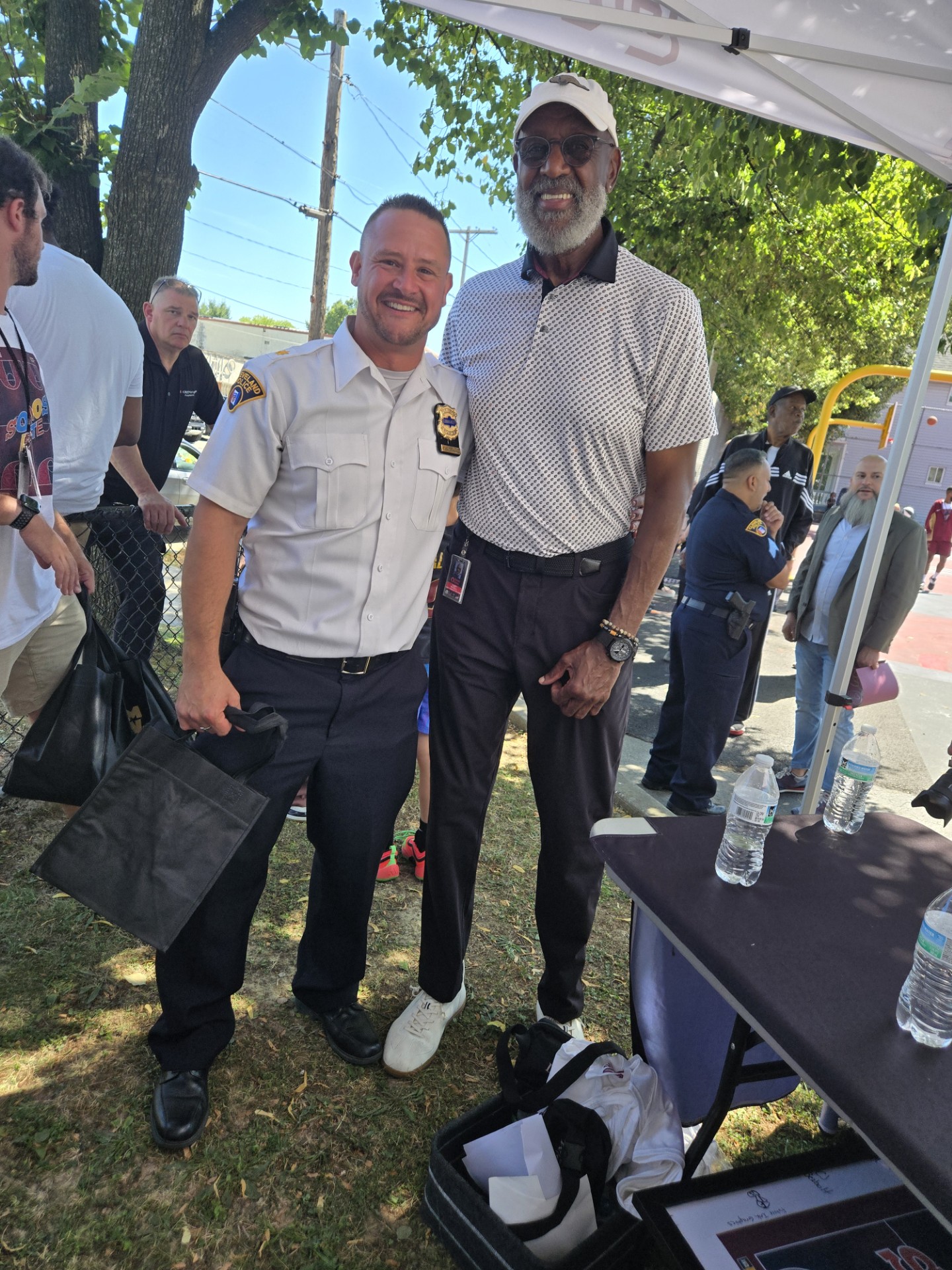 A Cleveland officer stands with a guest under a tent at the event, with others gathered in the background near the court.