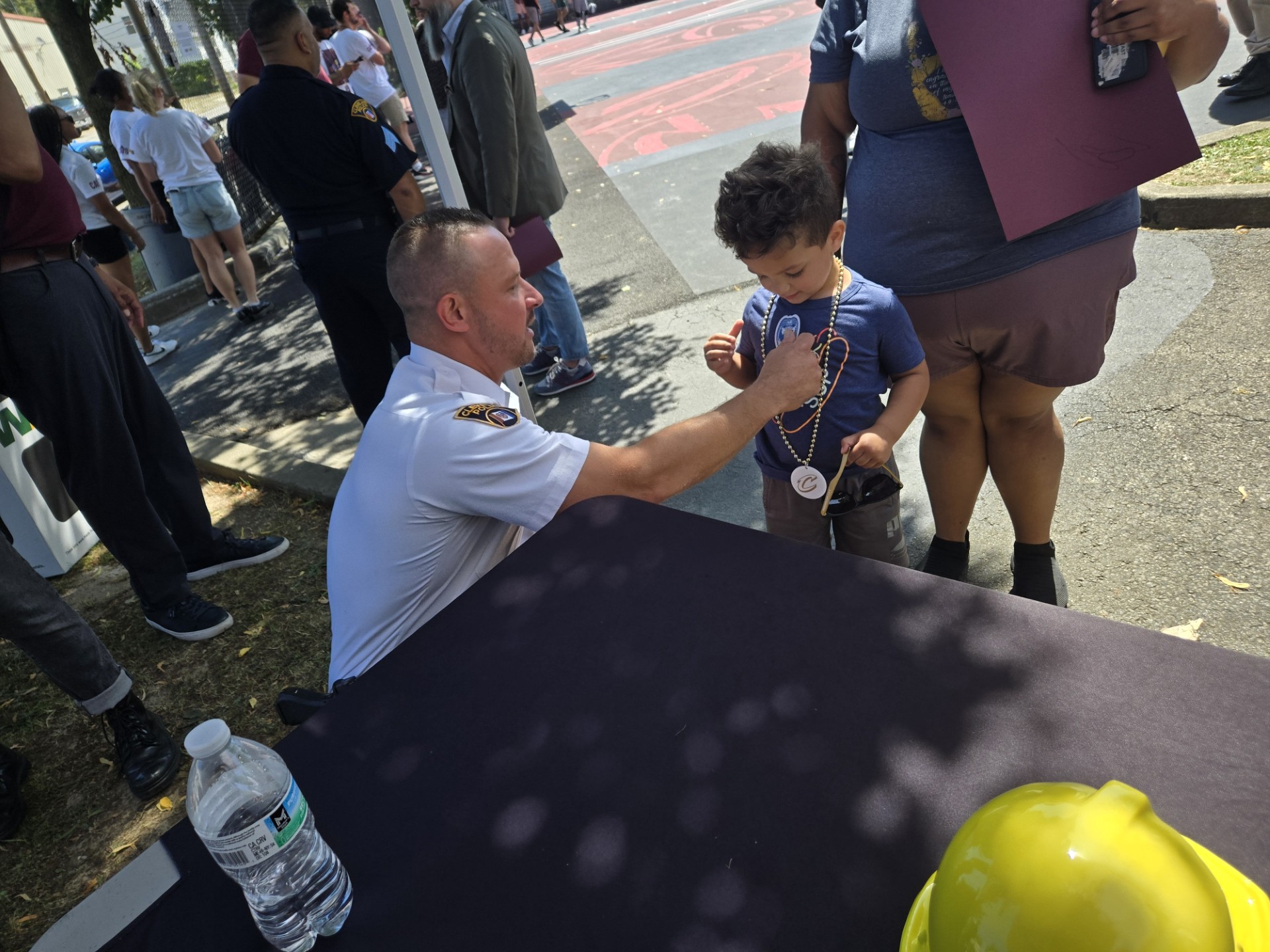 A Cleveland police officer kneels to talk with a young child wearing Cavs-themed medallions and holding sunglasses, while the child's guardian stands nearby.