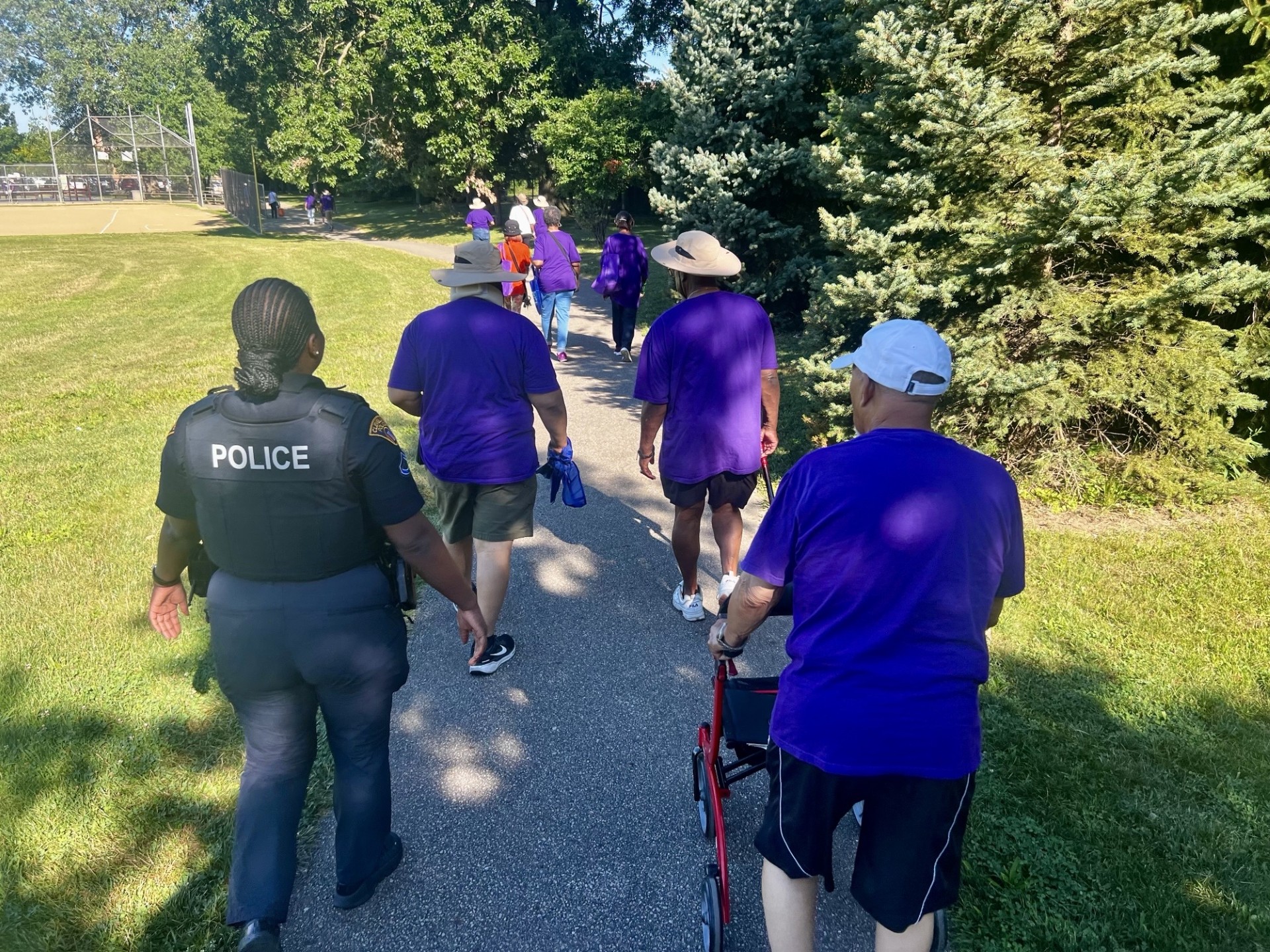 Officer walks alongside senior participants wearing matching purple shirts on the paved path at Loew Park.