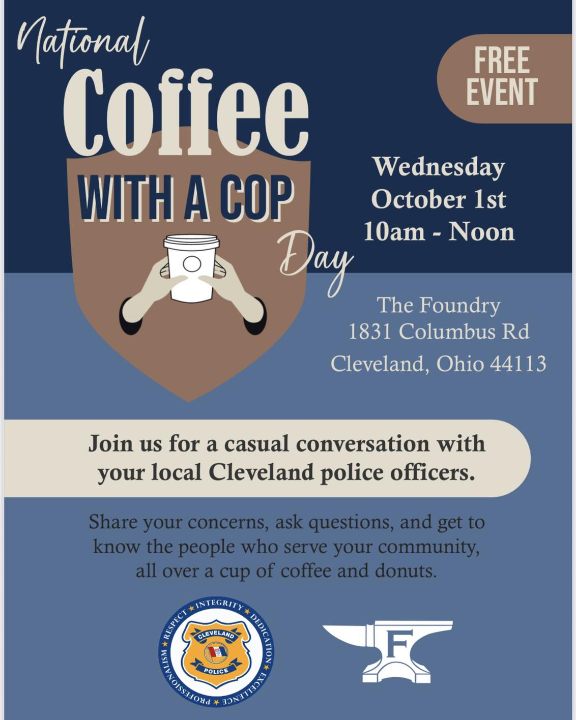 The Third District will host a Coffee with a Cop on Wednesday, October 1, 2025, from 10 a.m. to noon at The Foundry, 1831 Columbus Road in Cleveland.